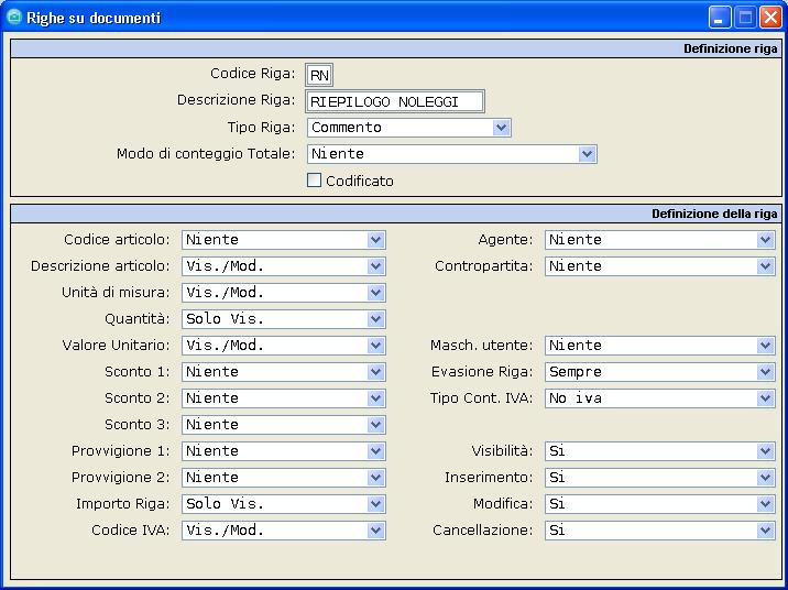 In Extra Business bisognerà creare il Tipo Riga - Riepilogo Noleggi con le seguenti impostazioni:
