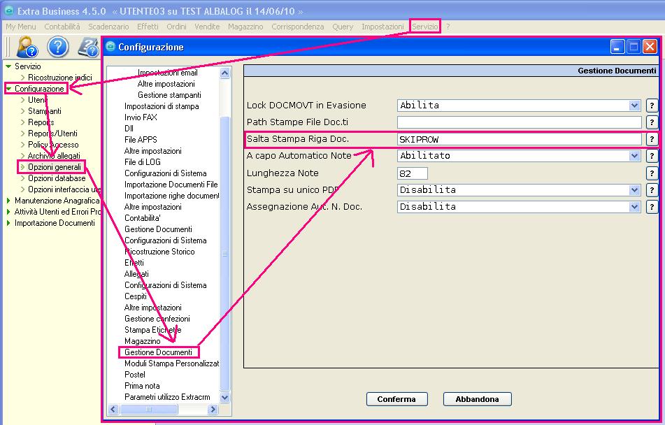 Anche all'interno dei parametri di configurazione di Extra Business, occorre inserire la seguente istruzione in Servizio>Configurazione>Opzioni Generali>Gestione Documenti (sotto la voce di menù "Magazzino"):