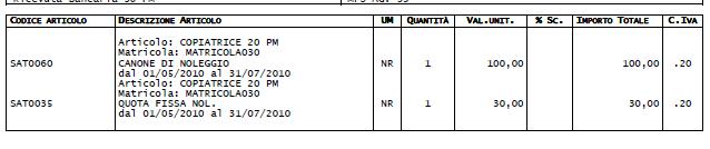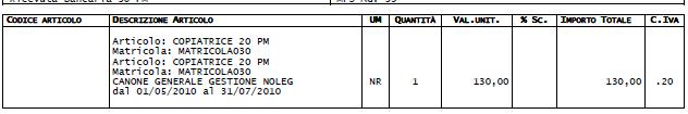 La fattura del contratto di Noleggio apparirà con la descrizione standard impostata nella Tabella Fatturazione Contratti di Service ma con, all'interno del dettaglio del documento, la voce riepilogativa che gli abbiamo definito.